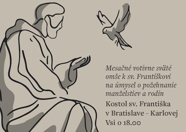 Bratislava 26. februára (TK KBS) V Kostole sv. Františka v Bratislave – Karlovej Vsi budú pravidelné mesačné votívne sväté omše k sv. Františkovi. Sväté omše sa konajú vždy o 18:00 a sú venované úmyslu o požehnanie manželstiev a rodín. Podujatie sa uskutočňuje každý mesiac podľa stanoveného harmonogramu, ktorý reflektuje duchovnú cestu a odkaz sv. Františka.