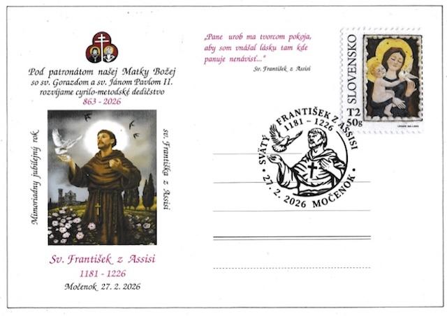 Močenok 27. februára (TK KBS) Pri príležitosti 800. výročia úmrtia sv. Františka z Assisi vydal Klub filatelistov 52-46 Močenok spolu s Farnosťou sv. Klimenta Močenok príležitostnú poštovú pečiatku a poštový lístok. Tieto filatelistické pamiatky budú k dispozícii na pošte v Močenku v dňoch od 27. februára do 10. marca 2026.