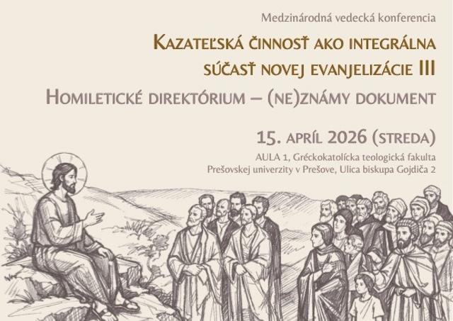 Prešov 14. apríla (TK KBS) Záujemcovia sú pozvaní na medzinárodnú vedeckú konferenciu s názvom „Homiletická činnosť ako integrálna súčasť novej evanjelizácie III“. Ústrednou témou tohto ročníka je „Homiletické direktórium – (ne)známy dokument“. Podujatie sa uskutoční v stredu 15. apríla 2026 o 8:30 v Aule A1 na Gréckokatolíckej teologickej fakulte Prešovskej univerzity v Prešove.